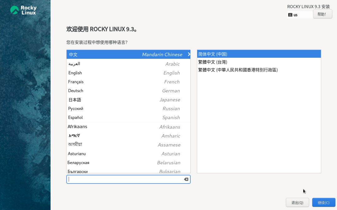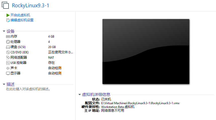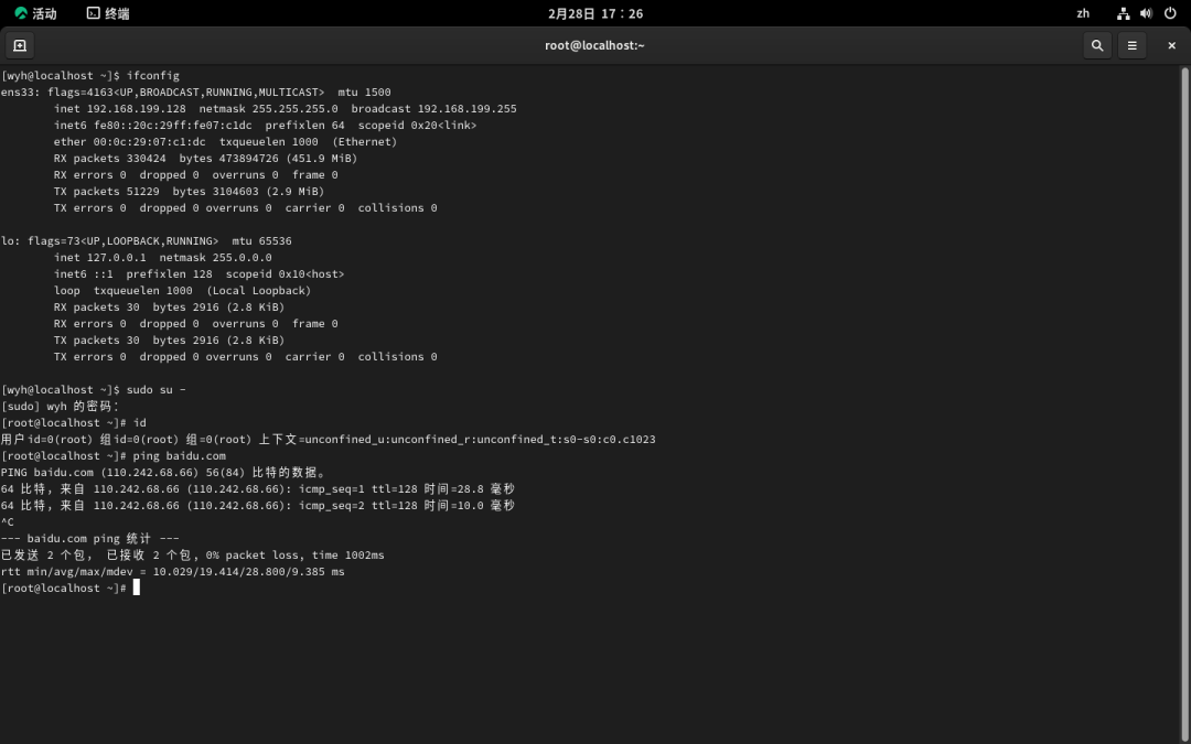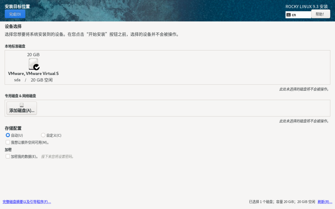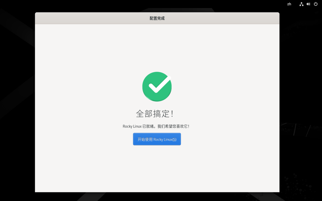 3.2.选择“Install Rocky Linux 9.3”。 3.4.进入信息摘要页面,点击“软件选择”→“带GUI的服务器”,点击“完成”。3.6.点击“root密码”,输入及确认密码“linuxjsz”,勾选“允许root用户使用密码进行SSH登录”3.15.到这里,Rocky Linux 9.3系统就安装完成了,打开终端。3.16.查看自动获取的IP,切换到root用户,测试是否可以正常上网,输入“poweroff”进行关机。