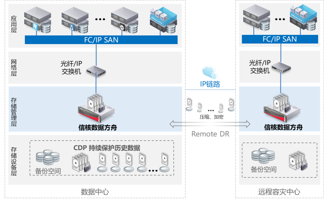 在生产中心和容灾中心分别部署数据方舟,生产中心数据在本地备份,同时采用异步增量复制的方式,将数据复制到容灾中心。