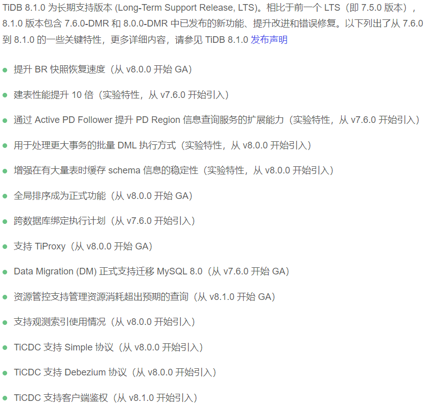 由以上官网说明可知,TiDB 8.1.0 是长期支持版本 (LTS)。它包含 7.6.0-DMR 和 8.0.0-DMR 版本中已发布的新功能,并做了提升和改进,以及错误修复。