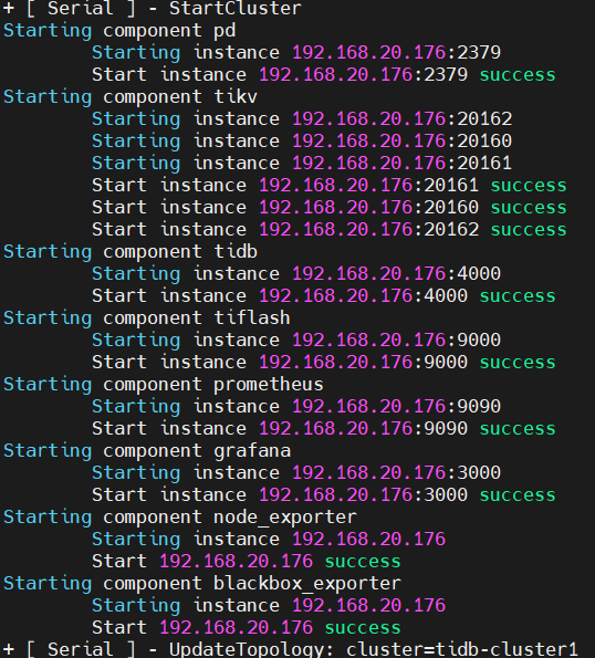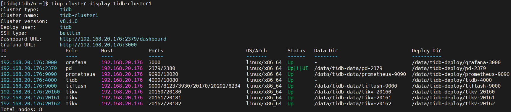 至此,完成了TiDB 8.1.0 集群的部署和启动,整个过程很顺畅,大约用了10多分钟。
