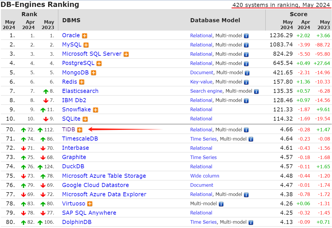 随后,我又查看了TiDB在本月全球数据库的排行情况,如下: