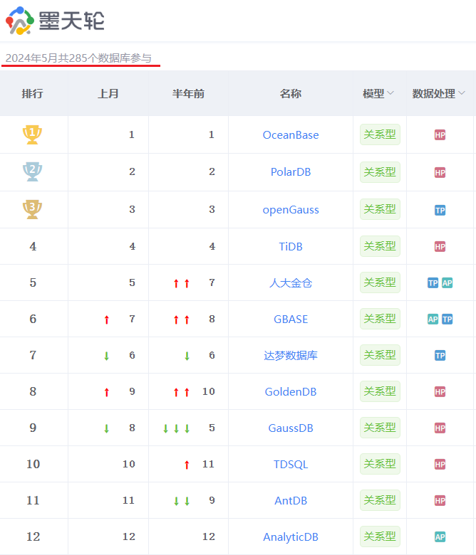 截取了本月墨天轮国产数据库排行榜的前12名,TiDB稳居第4,如下: