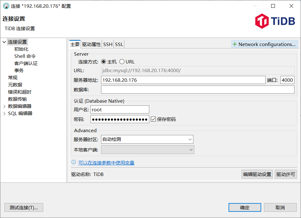 输入数据库主机IP、默认端口号4000、用户名root、并输入登录密码,如下所示: