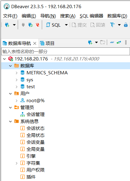 DBeaver成功连接到TiDB数据库后,界面如下: