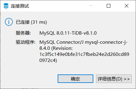 在输入完成TiDB数据库的相关信息后,点击左下层的“测试连接”按钮,成功连接,则显示如下提示框: