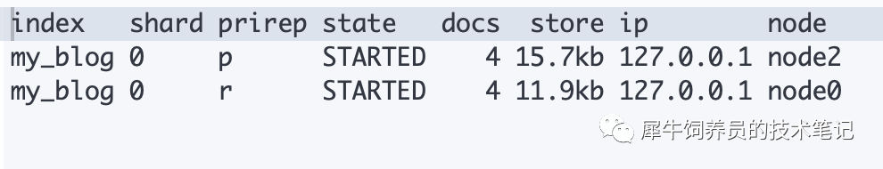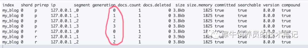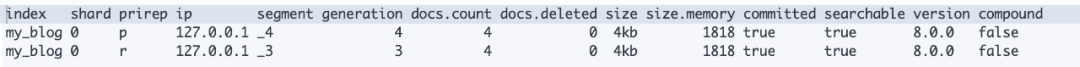 可以很清楚的看到,主分片和副本分片虽然文档数量都是4,但是大小一个是15.7KB,一个是11.9KB。前面说了原因,是因为主副分片中的segment数量不一样导致的。我们来证实下。