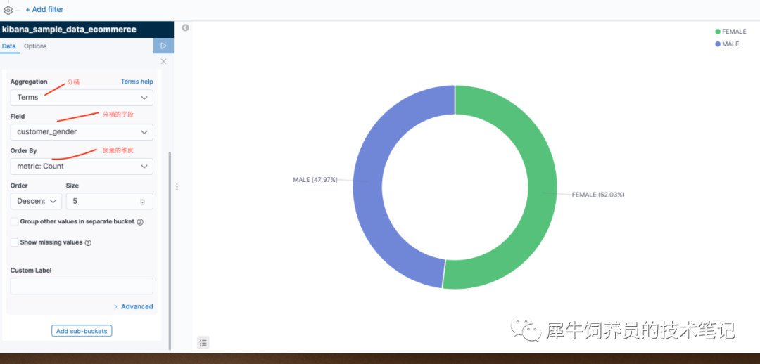 如上图所示,我们在左边选择分桶聚合模式,然后分桶的字段是用户性别字段,度量单位是count