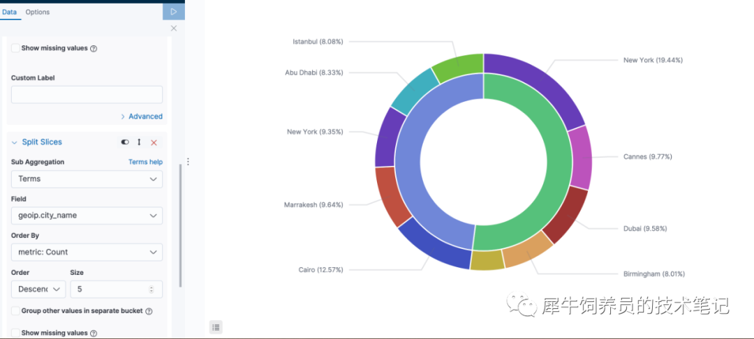 假如我们还想看下男女各自的城市分布情况,可以添加一个子分桶,在左侧下方点击add sub buckets