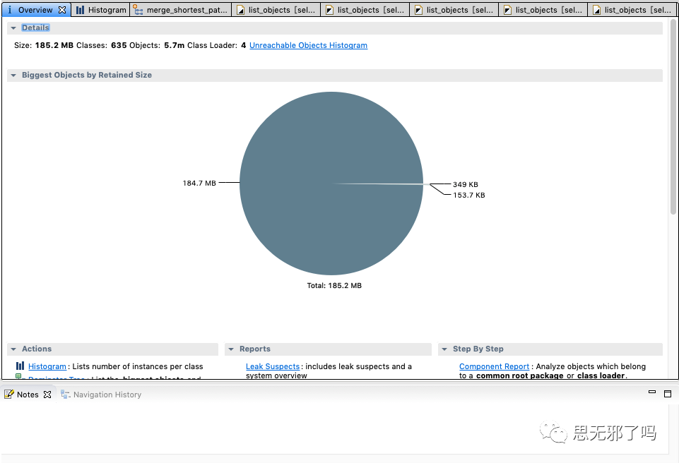 从预览图,可以看到有个应用占用了总的堆内存的大部分,高达184M(程序运行分配的堆内存是200M)。说明这个应用肯定有问题,值得我们继续往下分析。