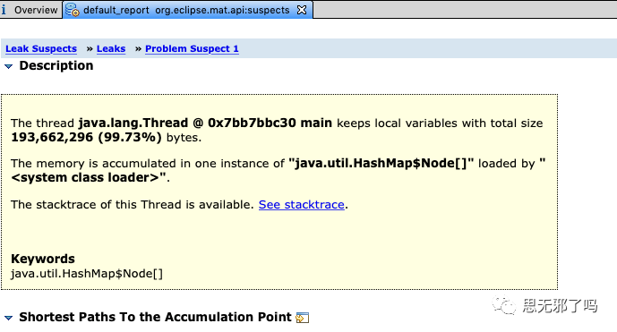 我们先看看工具给我们的一个判断,找到 Leak Suspects,点击去。