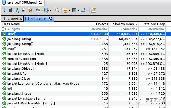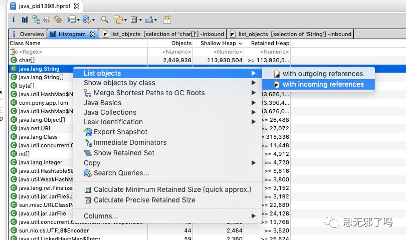 char[] 这个明显是String里引用造成的(string里用char[] 存储数据),我们之间来看String是被谁引用的,