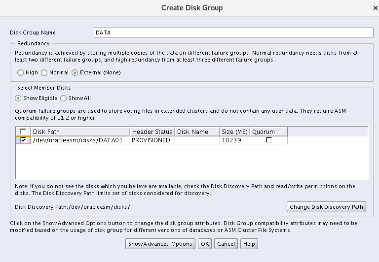 [root@racdb01 grid]# oracleasm createdisk data01 /dev/sdg1