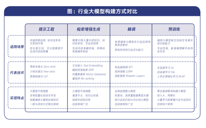 行业大模型的构建和应用中,由于需求和目标不同,技术实现复杂性差异也较大通过调研总结,目前机构在使用大模型适配行业应用过程中,从易到难主要有提示工程、检索增强生成、精调、预训练四类方式。