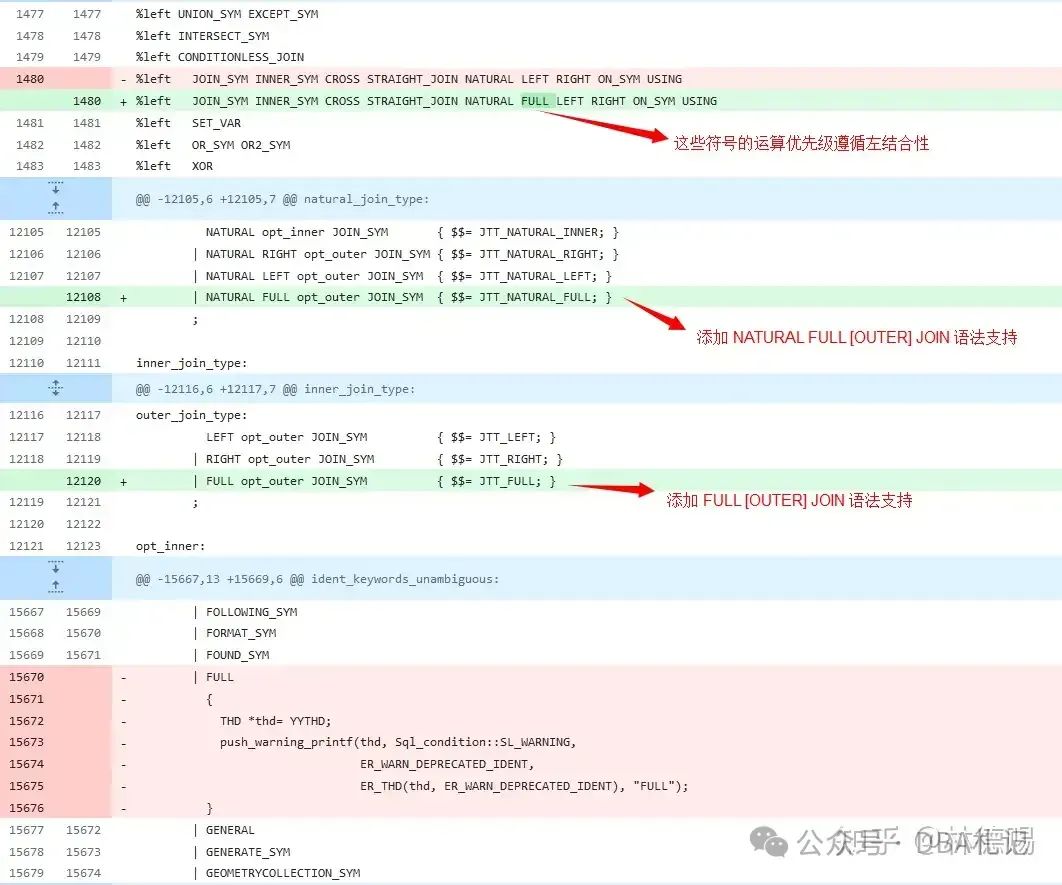 修改 SQL 语法配置规则支持 FULL JOIN 语法。运用从 BISON 学到知识,修改 sql/sql_yacc.yy
