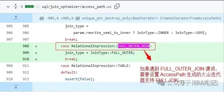 寻找到最佳 JOIN ORDER 路径后,会生成对应的 AccessPath。需要改造 AccessPath 生成火山迭代器时对 FULL JOIN 的支持。这次只做对 HASH JOIN 迭代器的改造,NEST LOOP JOIN 迭代器的改在以后有空再打造。