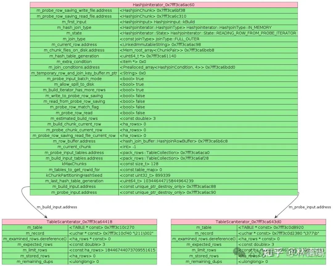 我们在 CreateIteratorFromAccessPath 函数末尾断点,查看生成的迭代器结构,可以看到最顶是 HashJoinIterator,它的左右两边都是 TableScanIterator: