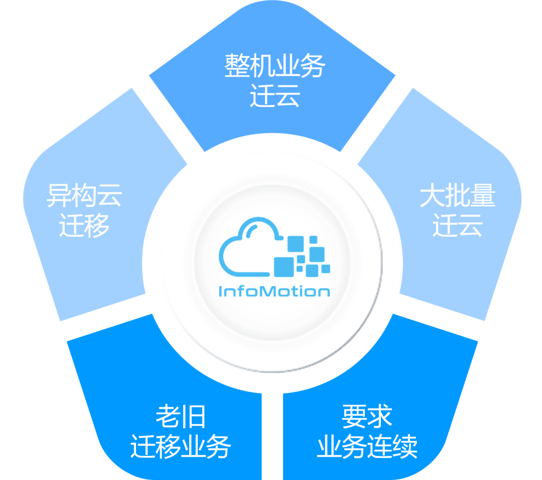 InfoMotion主要适用场景有上云迁移、云间迁移、数据中心迁移等,包括整机业务迁云、大批量迁云、异构云迁移、老旧迁移业务等迁移需求。