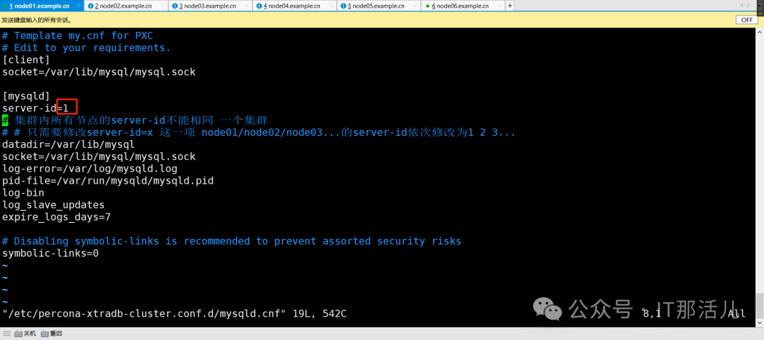 # 只需要修改server-id=x 这一项 node01/node02/node03的server-id依次修改为1 2 3