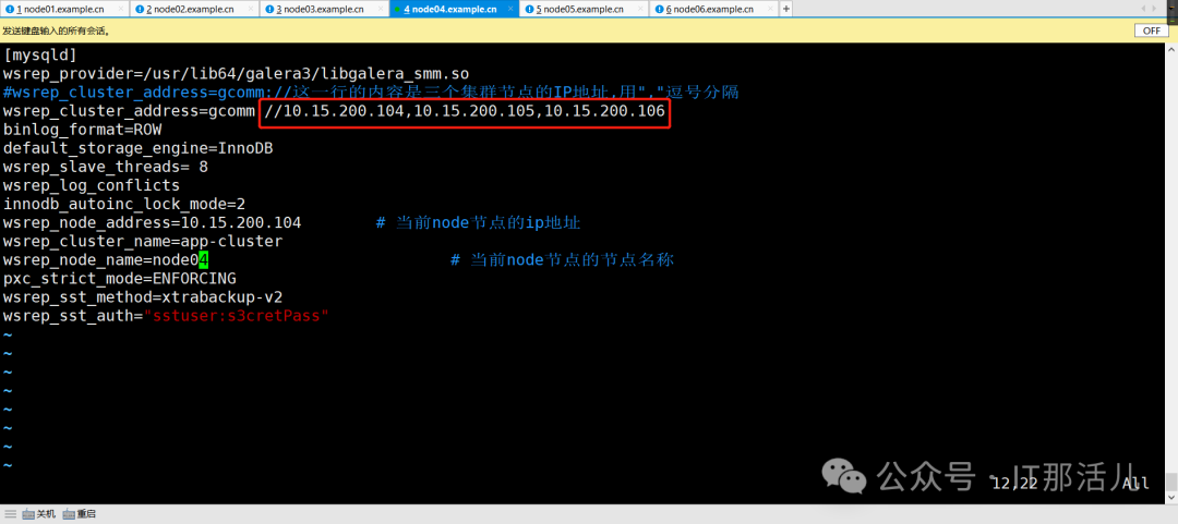 # wsrep_cluster_address=gcomm://这一行的内容是三个集群节点的IP地址,用","逗号分隔
