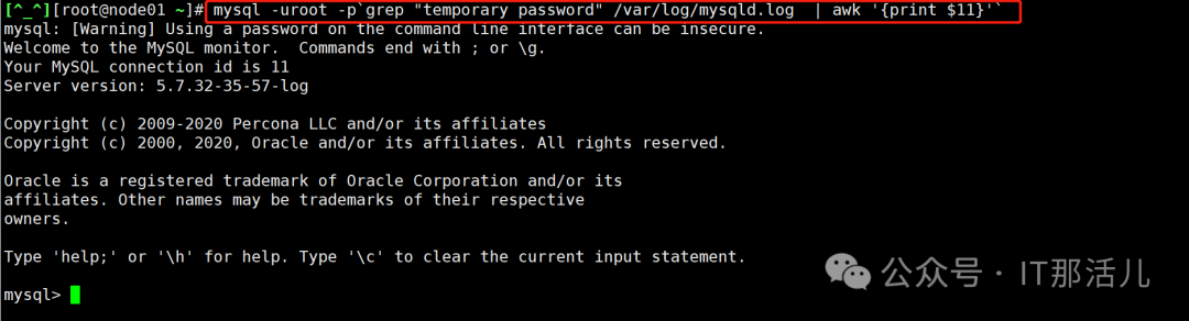 [root@node01 ~]# mysql -uroot -p`grep "temporary password" /var/log/mysqld.log | awk '{print $11}'`
