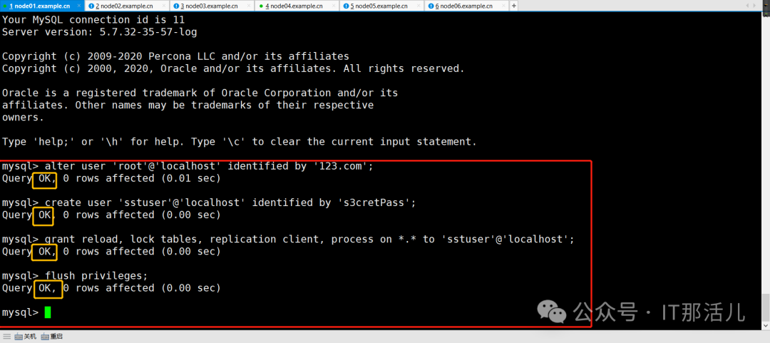 在主节点(node01 node04)上修改root密码并创建同步账号(同步账号需要跟/etc/percona-xtradb-cluster.conf.d/wsrep.cnf的键值wsrep_sst_auth对应)。