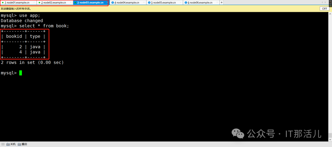 在任意节点创建一张表, 注意这里创建的表必须有主键, 查看其它节点是否有数据, 有就表示同步完成, 没有的话去看日志/var/log/mysqld.log查找原因。