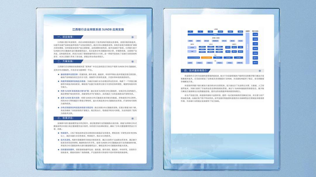 本次江西某省级城市商业银行的企业网银系统SUNDB应用实践,显著体现了全栈信创技术体系的强大优势。结合科蓝“双鱼座”业务中台,该系统进行了深度的技术架构升级与业务重构,极大地提升了金融产品的服务效率以及客户业务的处理能力。通过分布式微服务架构与SUNDB分布式数据库技术的融合,系统不仅实现了卓越的并发处理能力和灵活的横向扩展性,同时基于SUNDB数据库的高安全高性能能力以及精准的数据模型设计,充分释放分布式数据库在计算与存储方面的潜力,以满足用户高并发、高性能的业务需求。这一实践不仅强化了金融行业的系统性安全防线,同时也为客户带来了前所未有的业务处理效率与稳定性。
