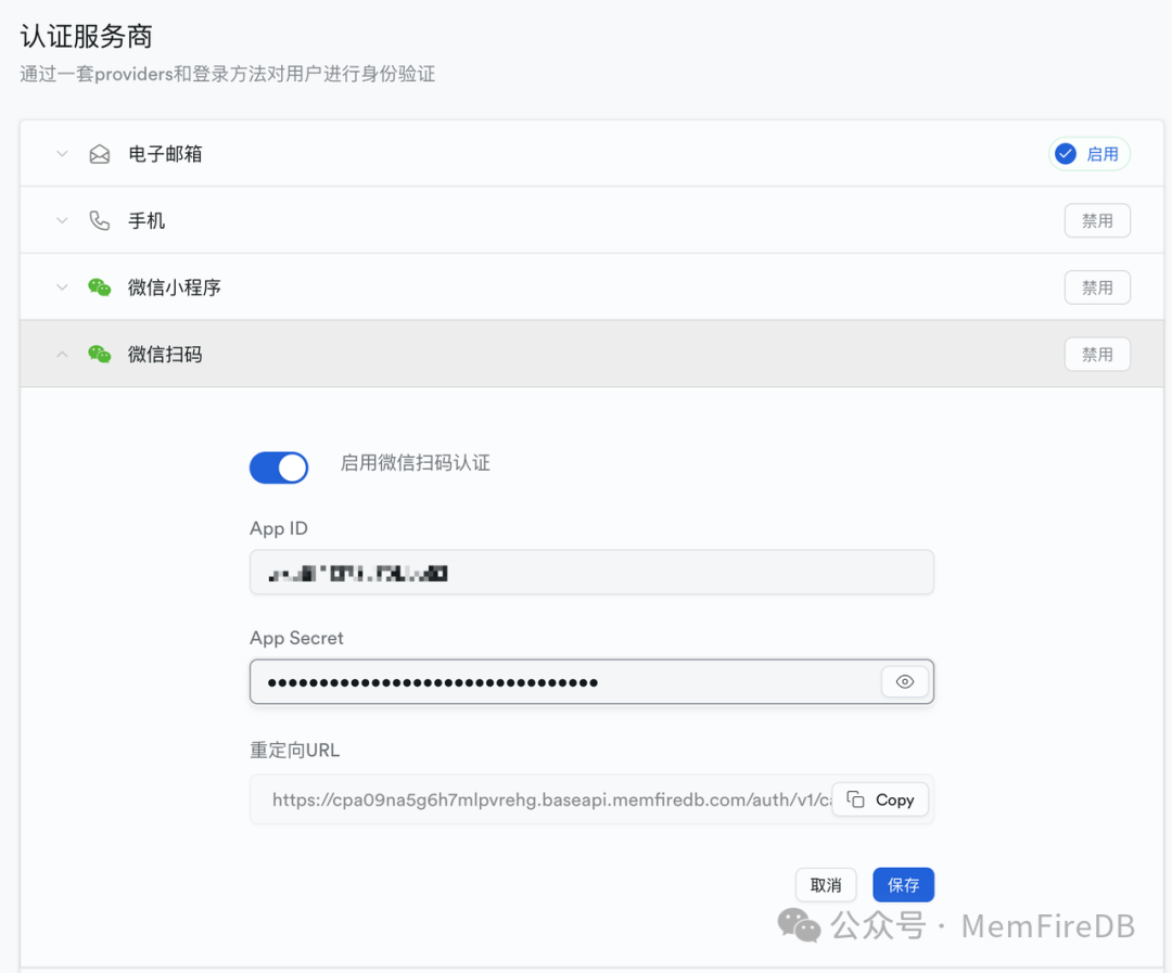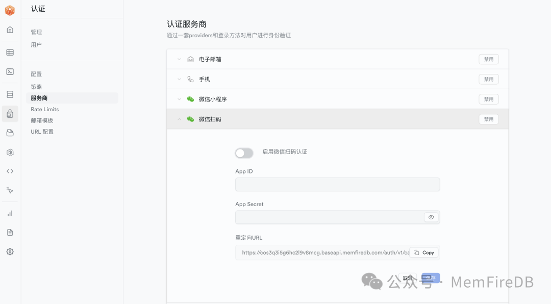 2、在MemFire Cloud应用界面启用微信扫码认证