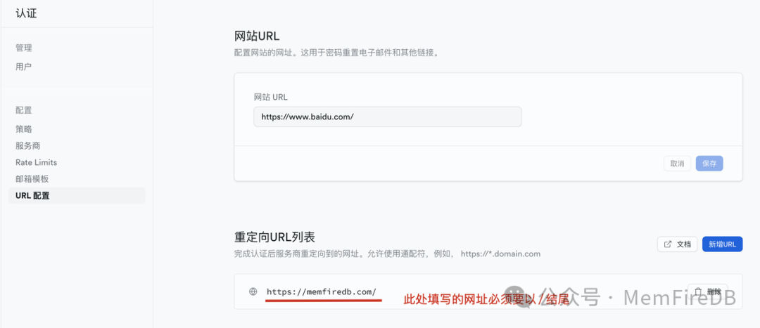 4、在MemFire Cloud应用界面进行重定向URL配置