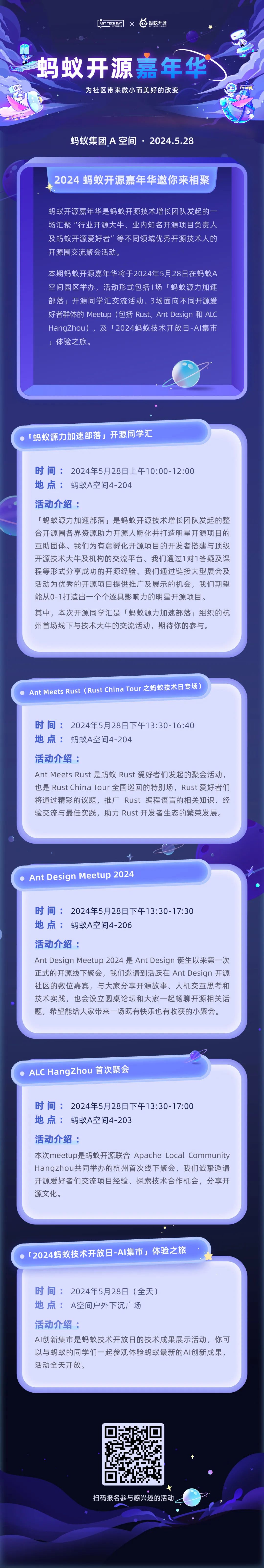本期蚂蚁开源嘉年华将于 2024 年 5 月 28 日,在蚂蚁 A 空间园区举办。活动形式包括: