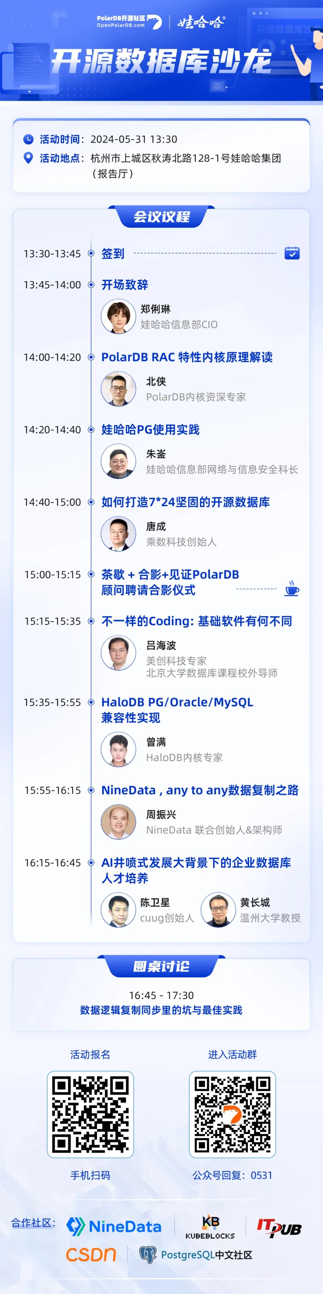 娃哈哈信息部 朱崟 科长将分享娃哈哈在PostgreSQL数据库方面的应用实践;