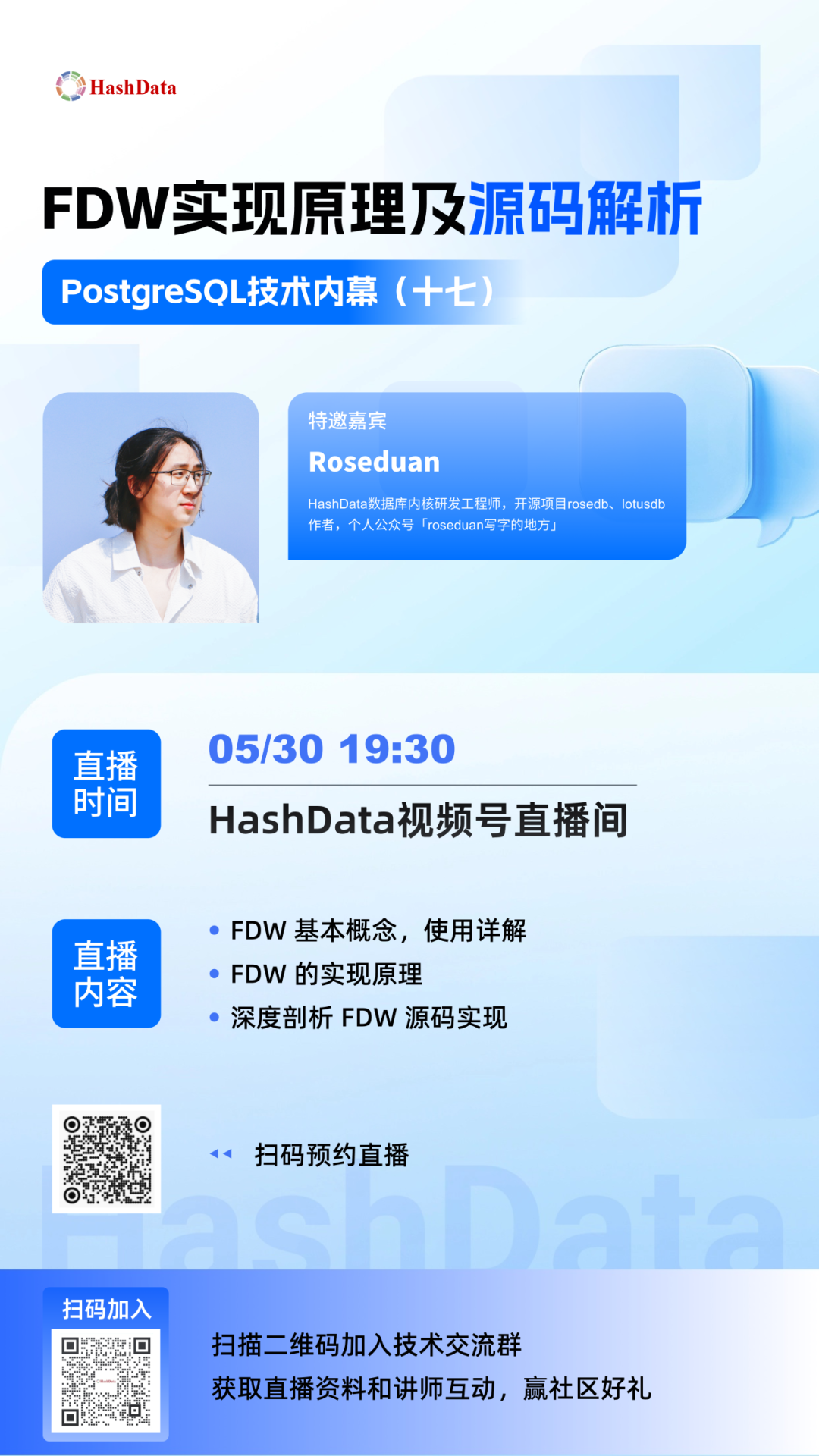 本期直播,我们非常荣幸邀请到了酷克数据HashData数据库内核研发工程师Roseduan老师。Roseduan老师将围绕以下三部分内容,带领我们一步步深入PostgreSQL FDW的基本概念、使用详解、实现原理以及源码实现,帮助大家全面理解并有效利用这一功能。