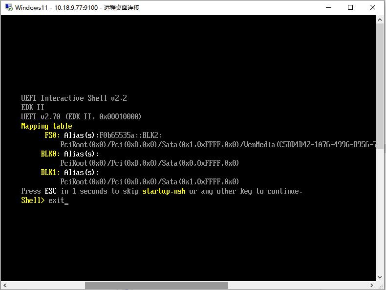 6.控制虚拟机桌面后,输入“exit”,然后按“Enter”键退出 EFI Shell 环境;
