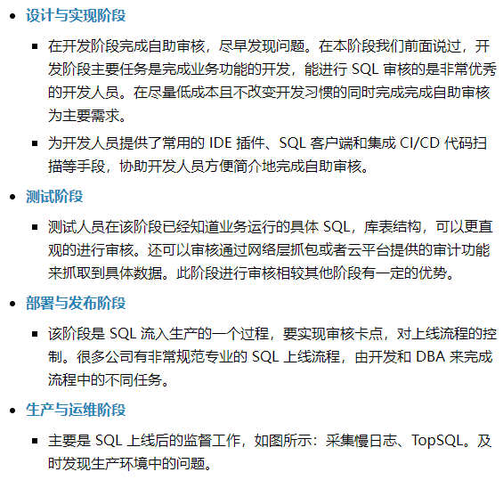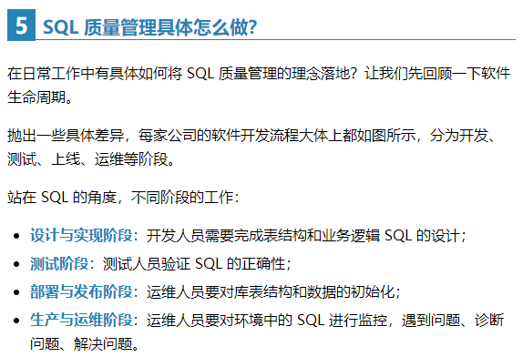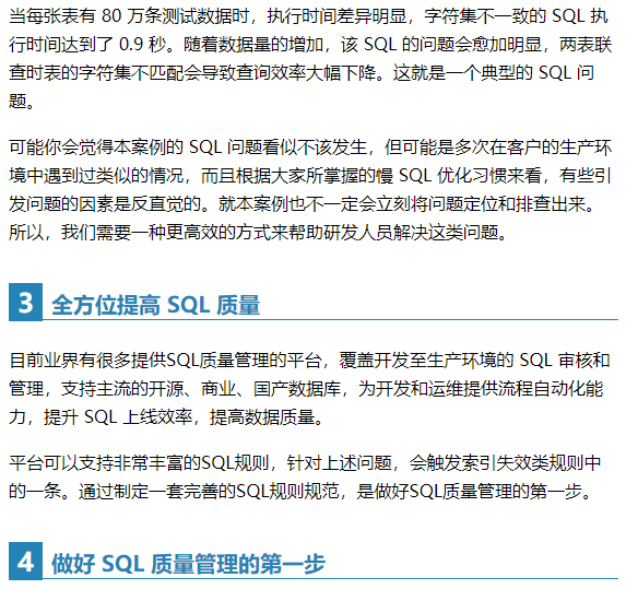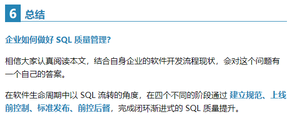 技术社群的这篇文章《行业观察 | 企业如何做好SQL质量管理?》给我们讲解了如何避免 “问题” SQL 流转到生产环境,保证数据质量的通用经验,这些都值得被研发/DBA/运维人员所重视。