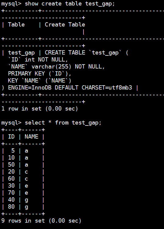 CREATE TABLE `t1` (`id` int NOT NULL AUTO_INCREMENT,`a` int DEFAULT NULL,`b` int DEFAULT NULL,`create_time` datetime NOT NULL DEFAULT CURRENT_TIMESTAMP COMMENT '记录创建时间',`update_time` datetime NOT NULL DEFAULT CURRENT_TIMESTAMP ON UPDATE CURRENT_TIMESTAMP COMMENT '记录更新时间',PRIMARY KEY (`id`),KEY `idx_a` (`a`)) ENGINE=InnoDB;