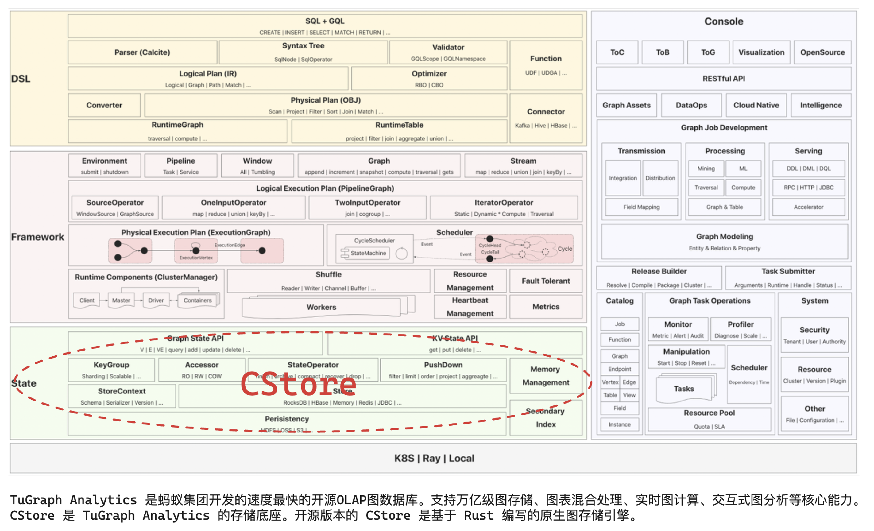 TuGraph-Analytics 是蚂蚁集团开发的开源 OLAP 图数据库。支持万亿级图存储、图表混合处理、实时图计算、交互式图分析等核心能力。CStore 是 TuGraph-Analytics 的存储底座。开源版本的 CStore 是基于 Rust 编写的原生图存储引擎。