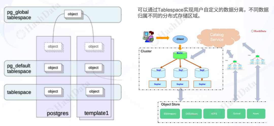 借助这种设计,HashData在数据的生产端和消费端之间构建了一个灵活的存储层。在存储层面,我们可以针对不同的存储产品开发相应的扩展,使Tablespace能够适应多样化的存储需求。这种设计理念不仅适用于跨云存储,还适用于跨不同存储产品的统一管理。我们可以通过定义不同的Tablespace来实现用户自定义的数据隔离,确保不同的数据可以归属到不同的数据分布区域。