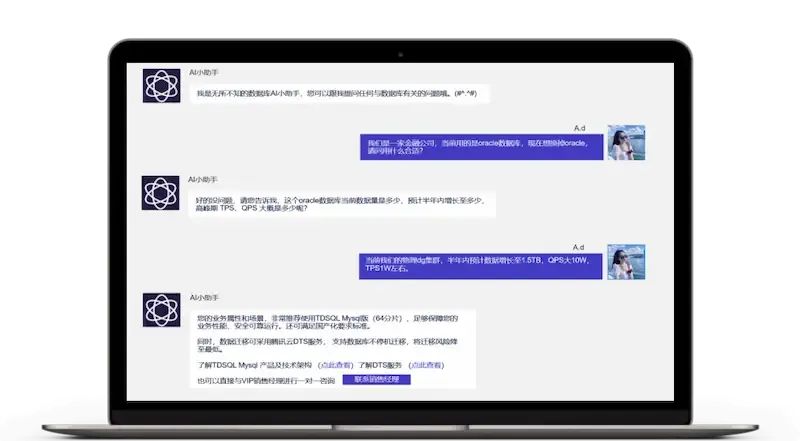 TDSQL 还有一个 AI 智能问答系统(下图)。它基于知识库与小模型训练,快速准确地响应用户查询,相当于一个智能客户,提供专业且个性化的解答。