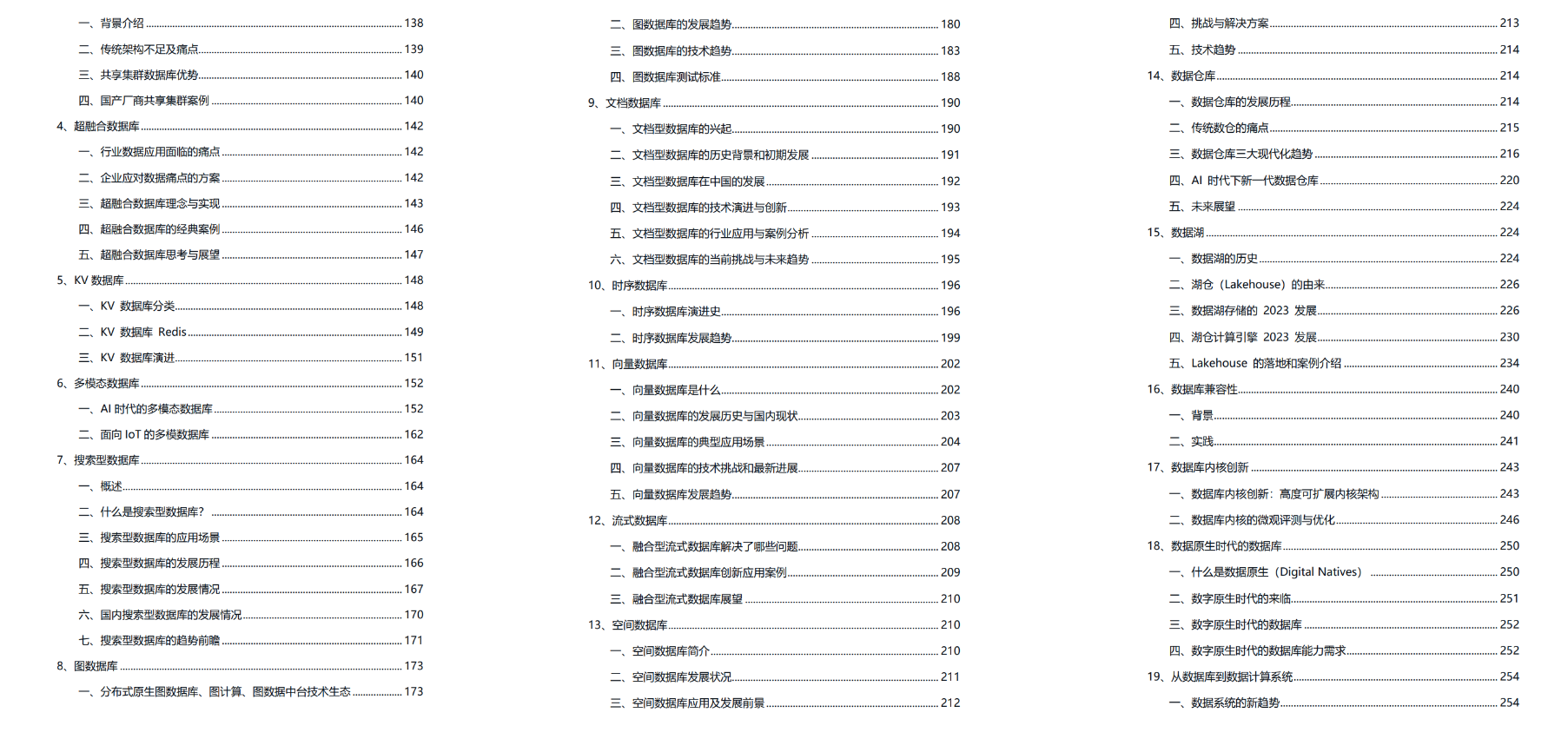 报告共分为三大章节,分别梳理了2023年中国数据库行业在技术、市场和应用等方面的发展历程和现状发展情况,数据库关键技术的架构演进、功能特性与发展趋势,以及数据库新兴硬件与生态产品的发展现状与融合创新趋势。