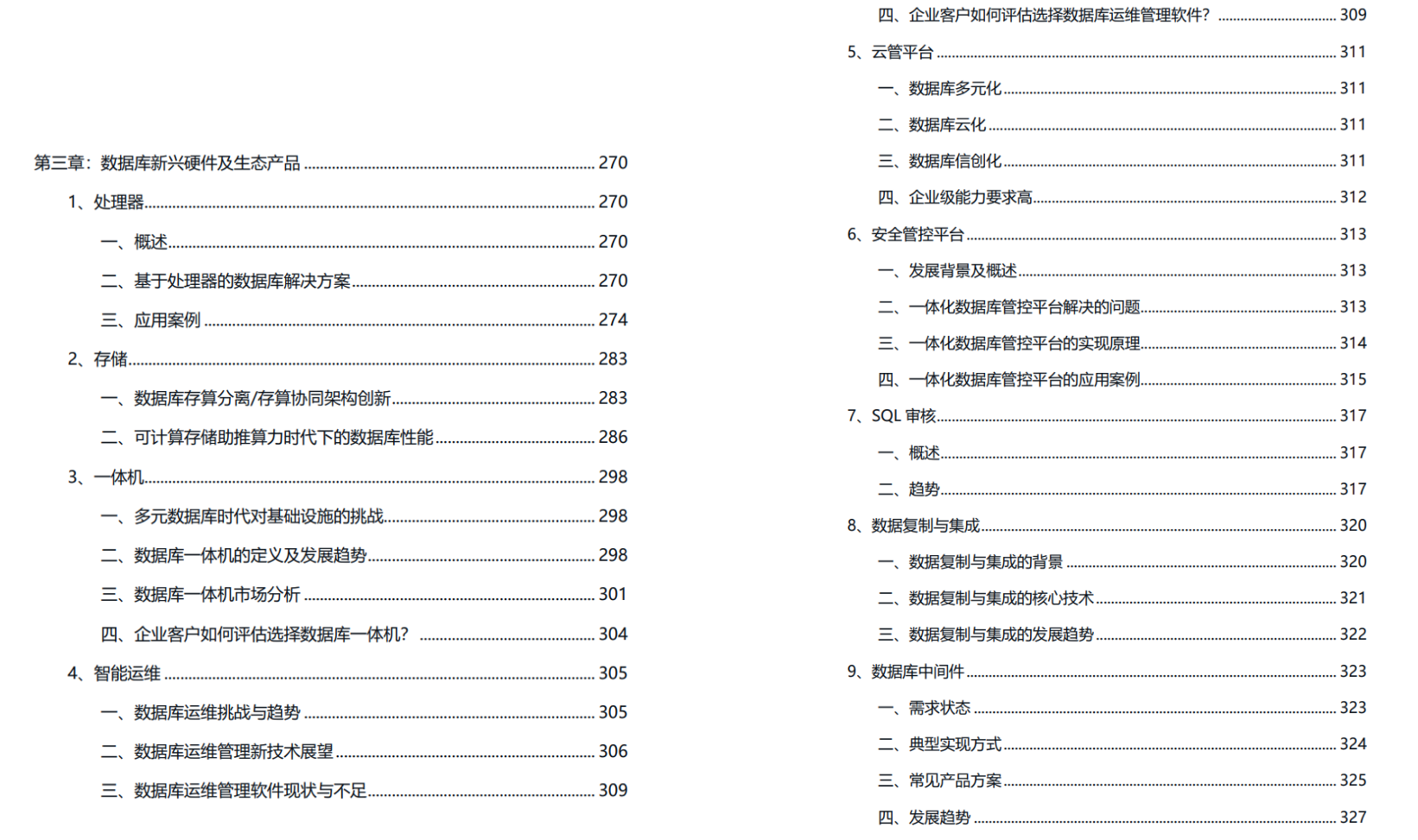 随着数字化转型的不断深入,业务需求也越来越多样化,充分利用新兴硬件资源提升数据库性能、提高数据库生态产品的多元性已经成为数据库发展的重要方向。本章节则主要介绍了处理器、存储、一体机、智能运维、云管平台、安全管控平台、SQL审核、数据复制与集成、数据库中间件等数据库新兴硬件及生态产品的发展历程、挑战与趋势,以及其功能特性与应用场景。