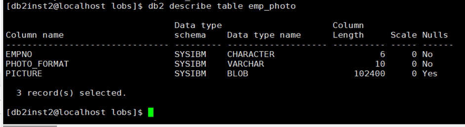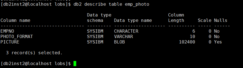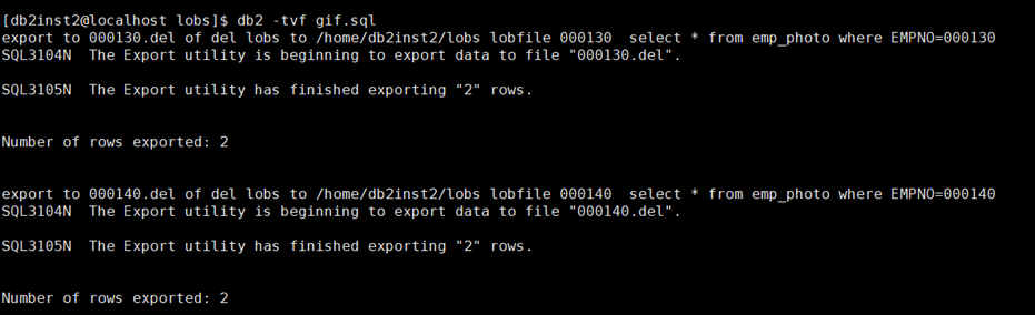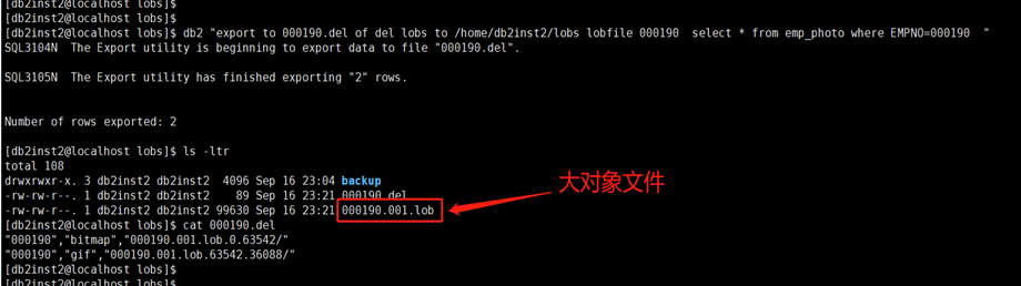 命令:db2 "export to 000190.del of del lobs to /home/db2inst2/lobs lobfile 000190 select * from emp_photo where EMPNO=000190 "