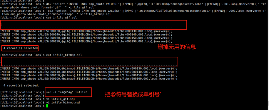 1)db2 "select 'INSERT INTO emp_photo VALUES('||EMPNO||',@gif@,FILETOBLOB(@/home/gbasedbt/lobs/'||EMPNO||'.001.lob@,@server@));' from emp_photo where photo_format='gif' " >infile_gif.sql