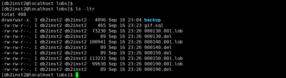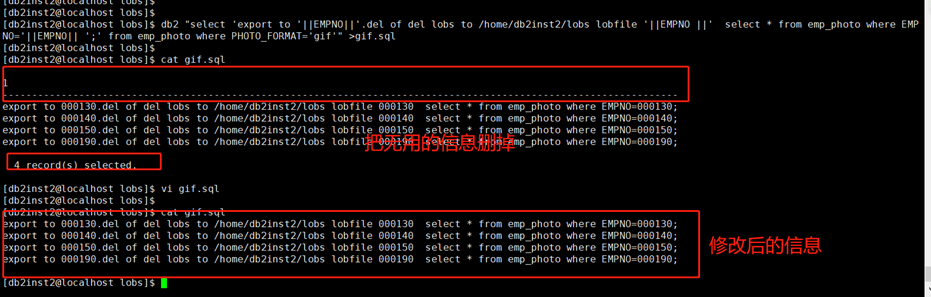命令:db2 "select 'export to '||EMPNO||'.del of del lobs to /home/db2inst2/lobs lobfile '||EMPNO ||' select * from emp_photo where EMPNO='||EMPNO|| ';' from emp_photo where PHOTO_FORMAT='gif'" >gif.sql