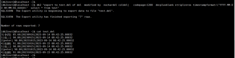 db2 "export to test.del of del modified by nochardel coldel| codepage=1208 decplusblank striplzeros timestampformat=\"YYYY-MM-DD HH:MM:SS.UUUUU\" select * from test"