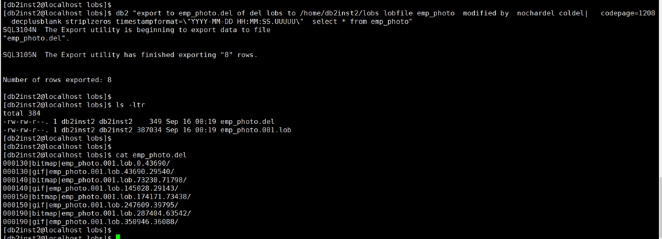 命令: db2 "export to emp_photo.del of del lobs to /home/db2inst2/lobs lobfile emp_photo modified by nochardel coldel| codepage=1208 decplusblank striplzeros timestampformat=\"YYYY-MM-DD HH:MM:SS.UUUUU\" select * from emp_photo"