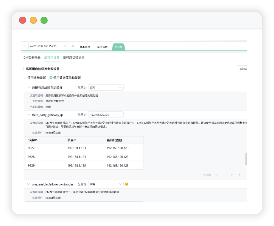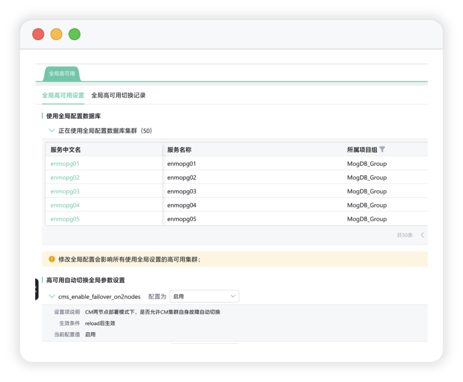 灵活调整参数配置 允许用户根据自身业务需求,灵活调整不同数据库的高可用配置策略,适应不同的部署环境和容灾需求,且可以选择参数配置是否立即生效,大幅增强系统的适应性和可靠性。