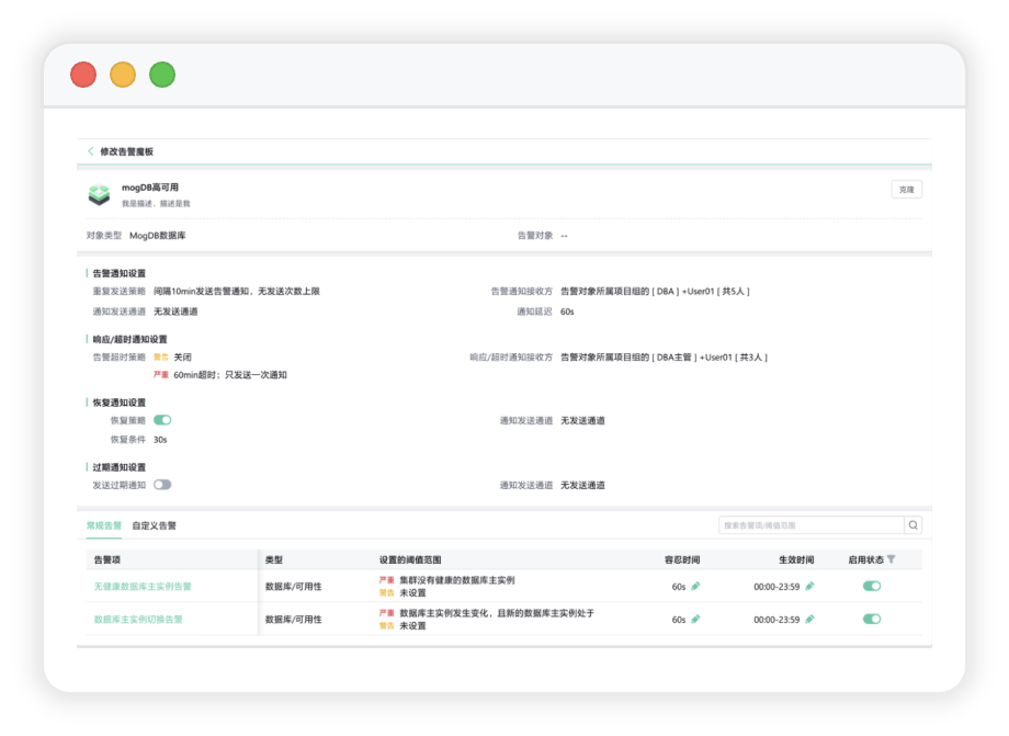 主动告警机制 通过主动监控并及时发送告警通知,特别是在主实例状态变化时,能够有效避免“单点故障”带来的风险,保证运维团队能够及时响应。