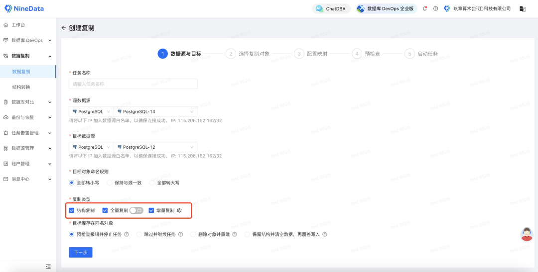 2. 根据页面提示配置复制任务,为保证完整将源端的全量数据和增量数据迁移至目标端,需要在