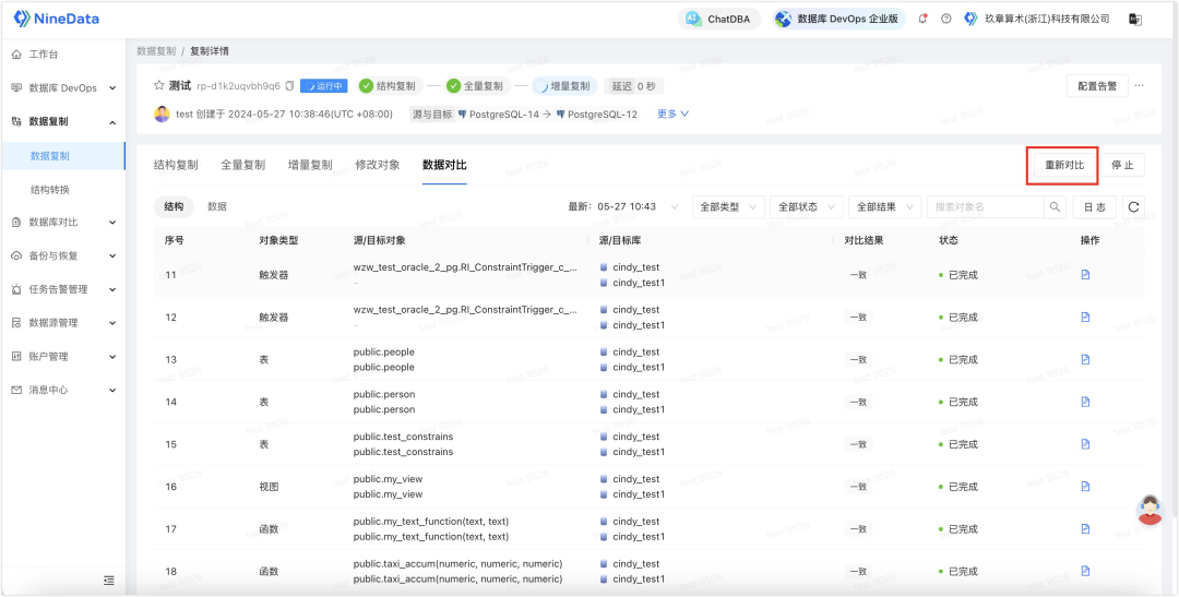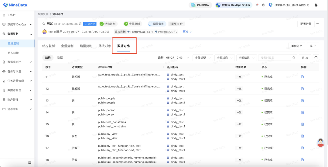 除了同步功能以外,NineData 还提供了同步后源端和目标端同步数据的对比功能,以确保目标端数据的完整性。