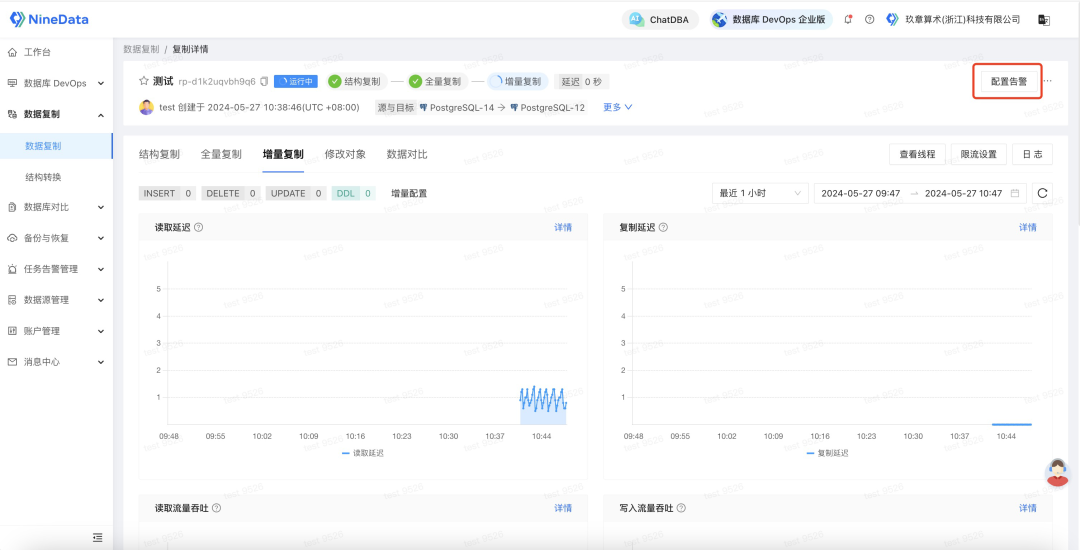 3. 配置完成后启动任务,针对您配置的所有同步对象,NineData 会先对所有的存量数据进行全量迁移,接下来就是实时迁移源端中新增的增量数据,所有新写入的数据都将一条不漏地同步到目标端,每当目标端的增量数据追平源端时,任务面板中会显示